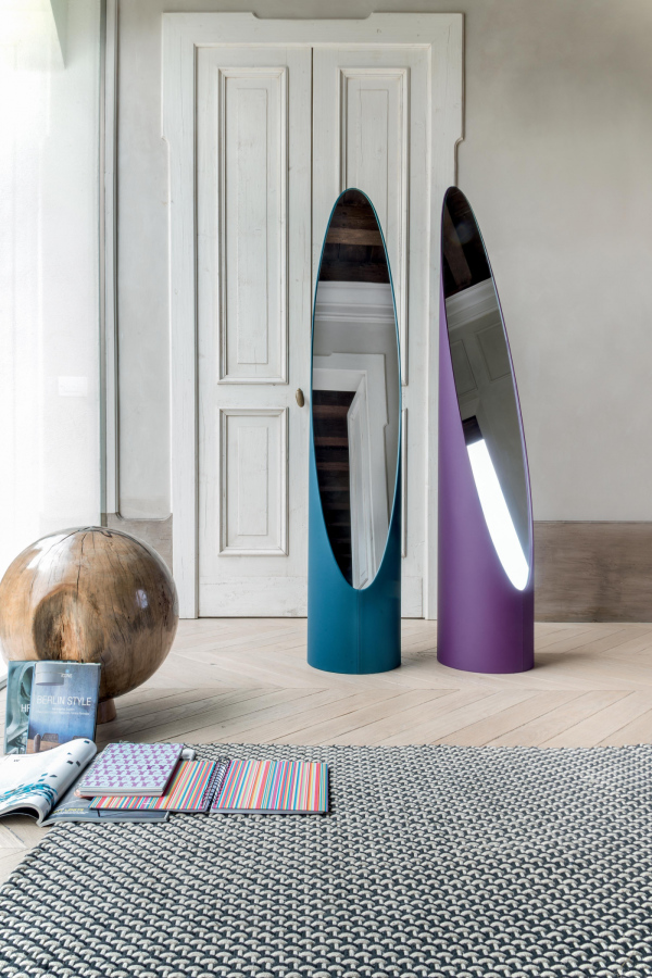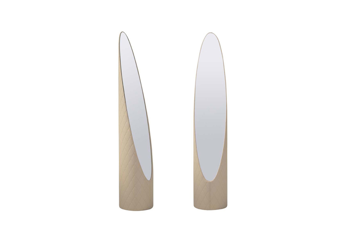 Designové luxusní zrcadlo s tělem potaženým kůží s vyšívaným vzorem.