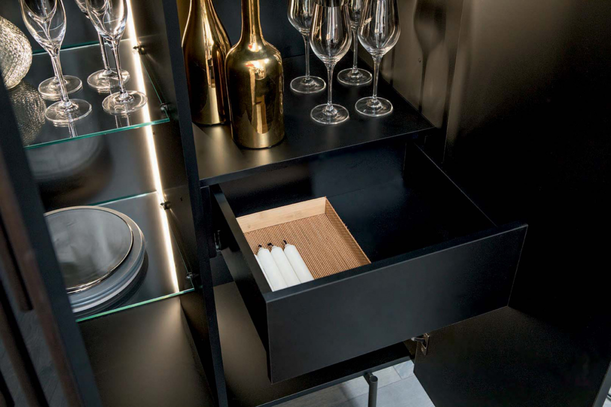 - vysoká komoda/příborník: 100 x 47 x 134 cm – obsahuje skleněné police a zásuvku ze dřeva