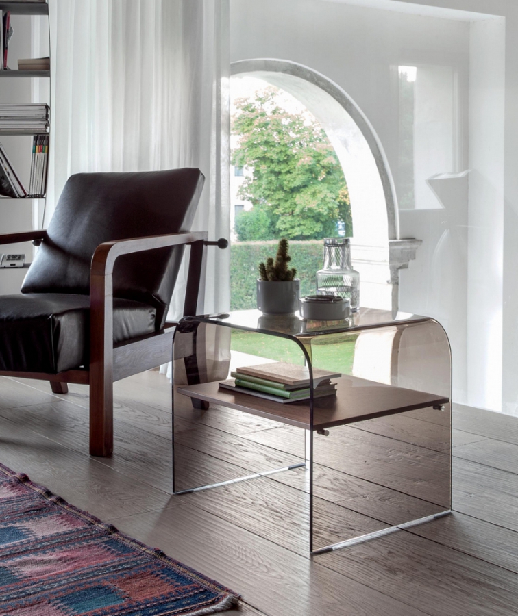 - menší stůl je dostupný ve variantě s praktickou policí ve skleněném či dřevěném provedení (ořech Canaletto, pálený dub)