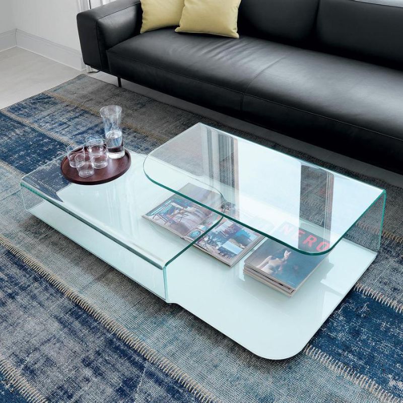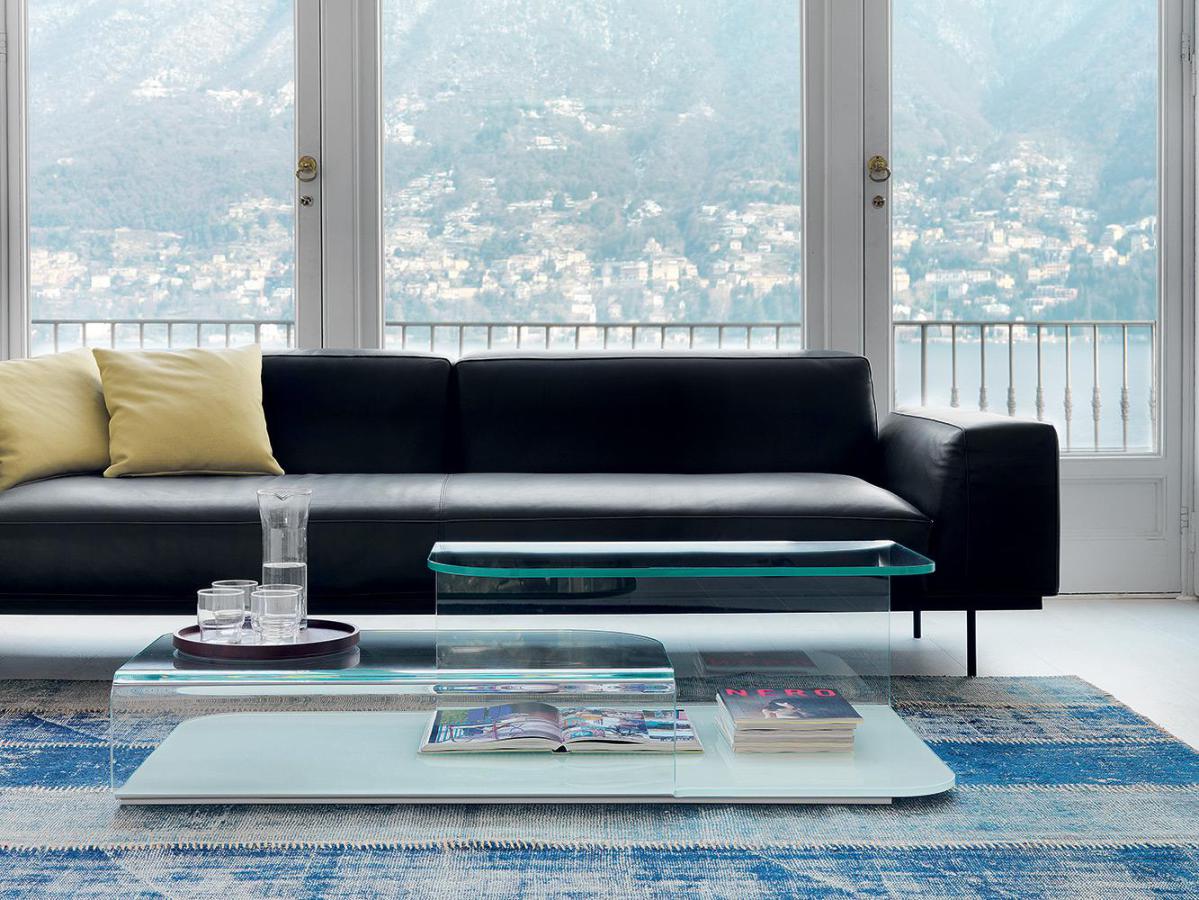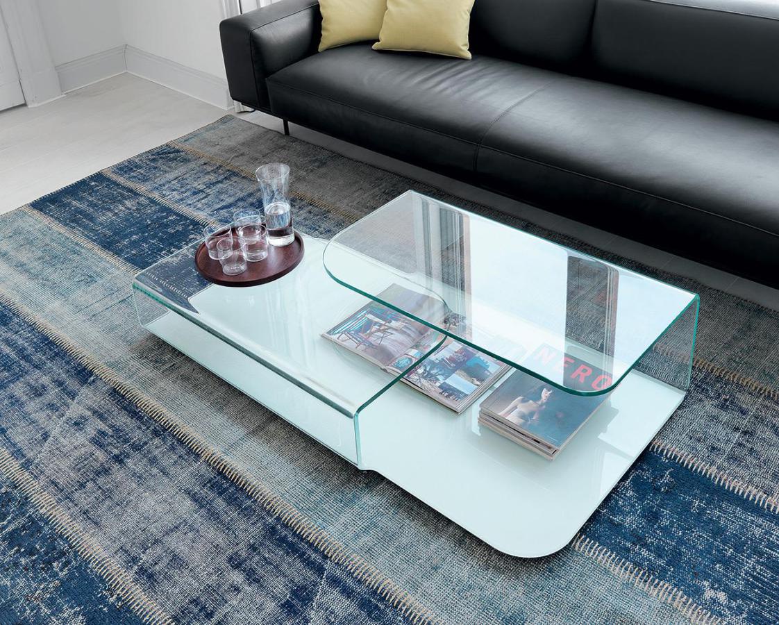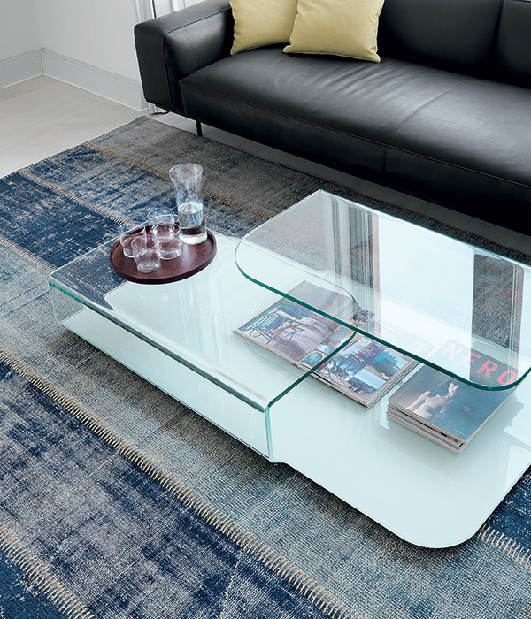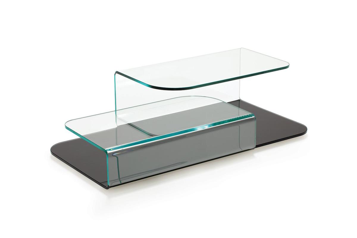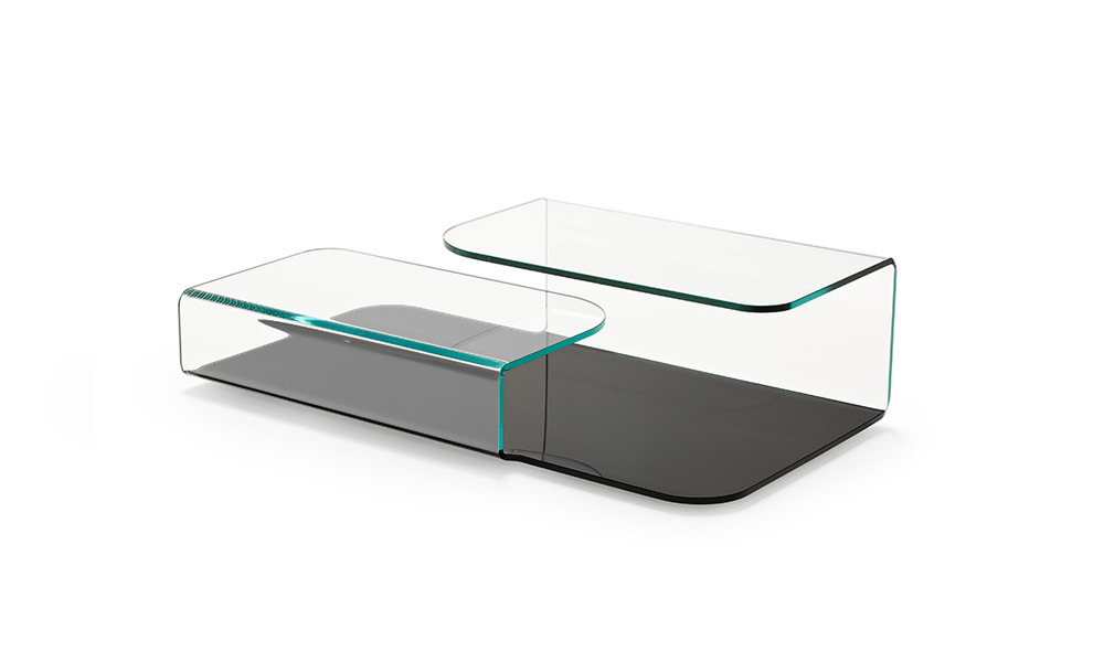 Elegantní konferenční stůl Hug je tvořený odkládacími deskami dvou výšek z ohýbaného skla. Lakovaná spodní základna mnoha barevných odstínů.