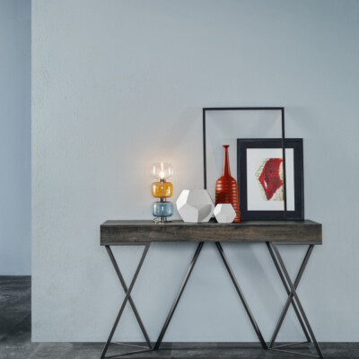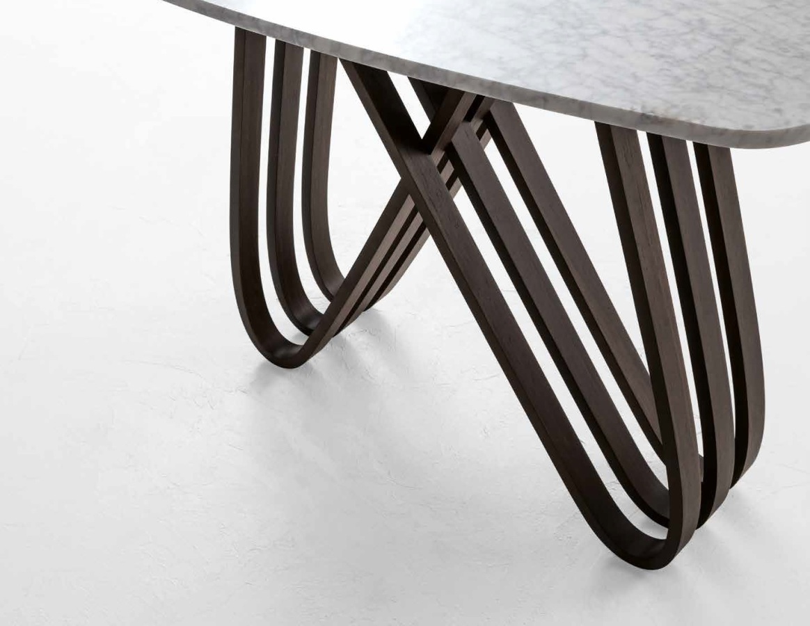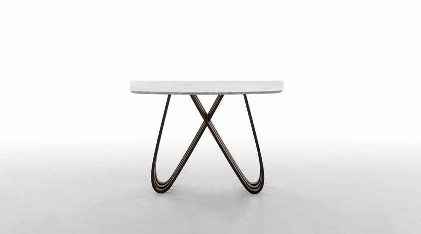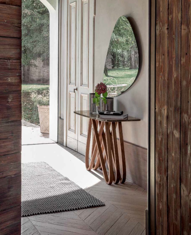 U designové konzole Arpa se prolínají dva různé styly – nádherná podnož z ohýbaného dřeva a zaoblená deska ze skla, mramoru nebo keramiky. Tento produkt je patentován výrobcem.