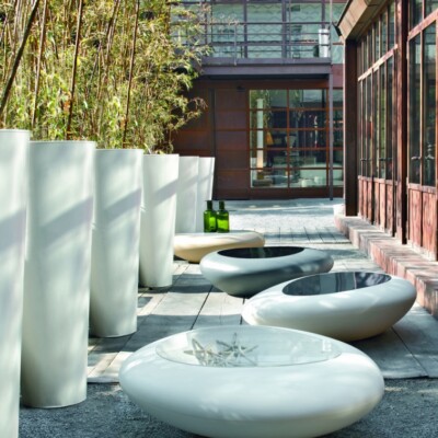 Taburety a konferenční stolky Plissé se skleněnou nebo keramickou deskou lze mezi sebou jednoduše a hravě kombinovat. Tvoří je ručně skládaná, tzv. „plisovaná“ ekokůže.
