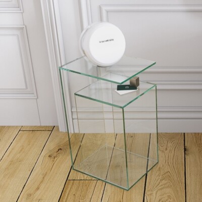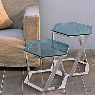 Unikátní kombinace podstavce a šestihranné skleněné desky vytváří hru tvarů. Postavením několika stolků vedle sebe docílíte jedinečných obrazců.