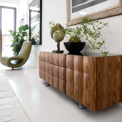 Komoda Modena audio má tři dvířka a audio zabudované za vyklápěcími dvířky. Obsahuje také zabudované LED světlo a technickou zásuvku.