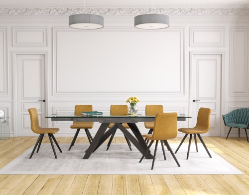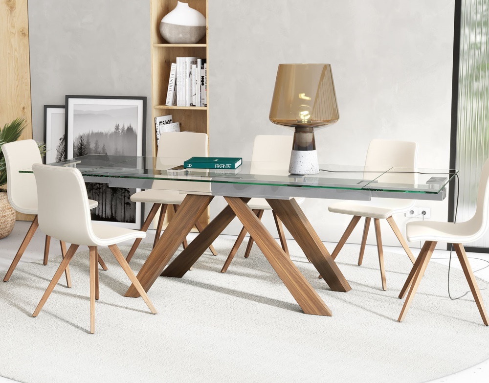Rozkládací jídelní stůl Osaka disponuje zajímavou podnoží, která nádherně vynikne pod deskou z čirého skla. Stůl nádherně doplní jídelní židle Osaka.