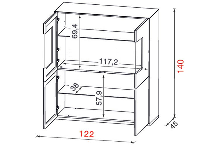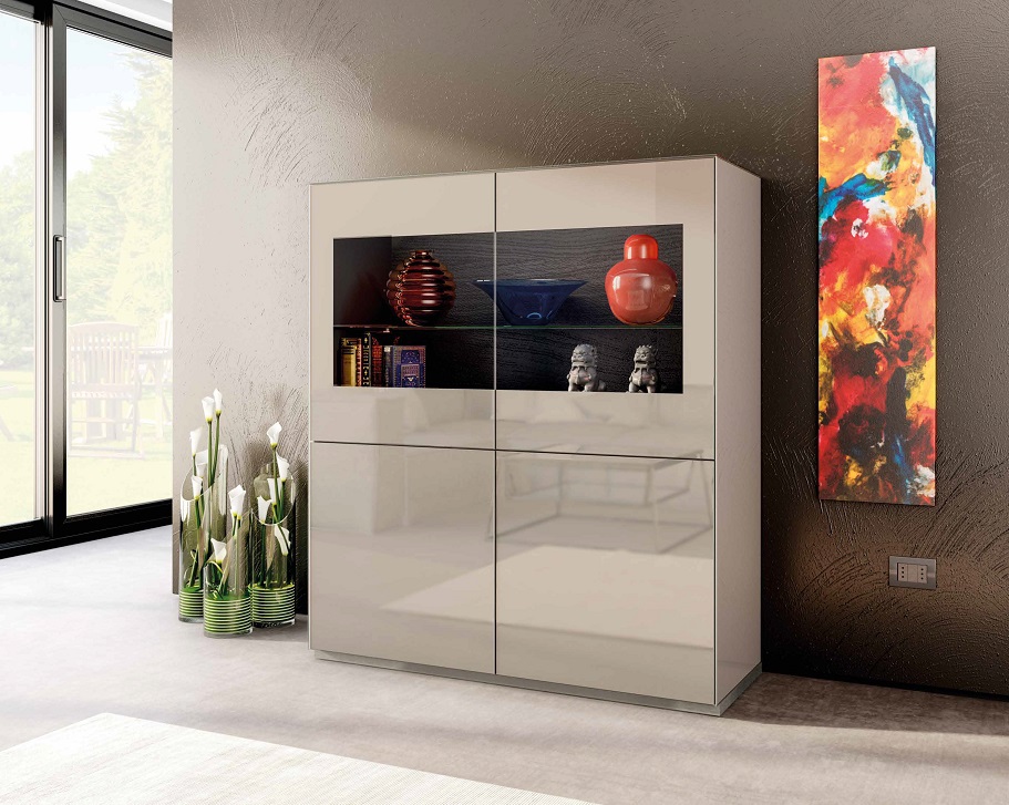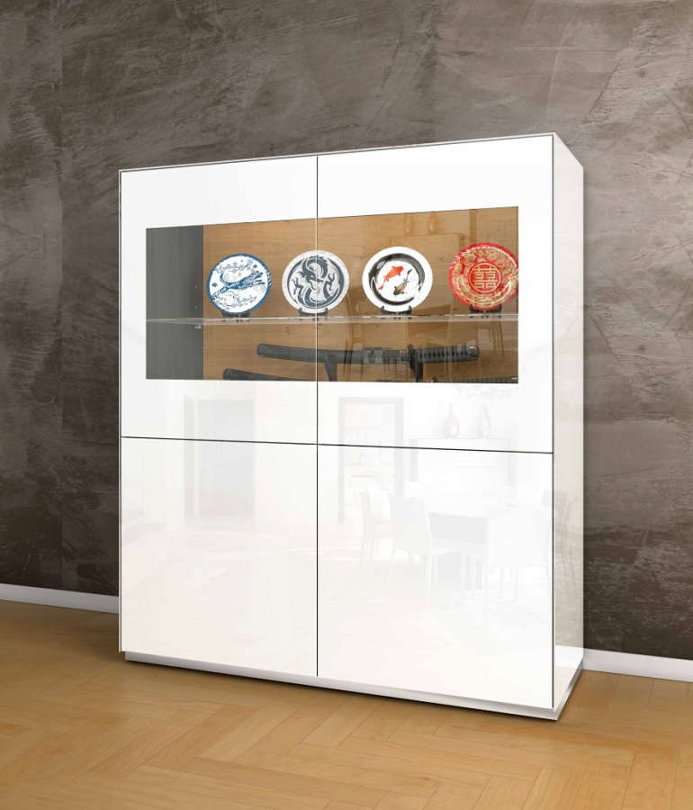 Komoda má 4 dvířka – horní jsou prosklená