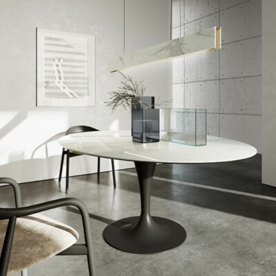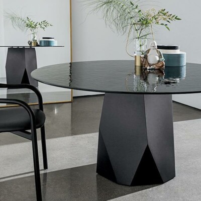 Jídelní stůl Deod představuje tvary a materiály, které jsou v přirozené rovnováze geometrie díky ikonické základně inspirované liniemi Dolomit.